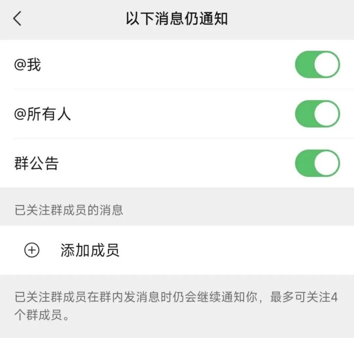 在开启“消息免打扰后”,可以看到,原本的“关注的群成员”改成了“以下消息仍通知”。