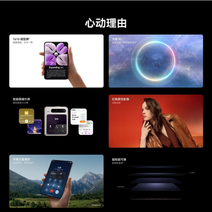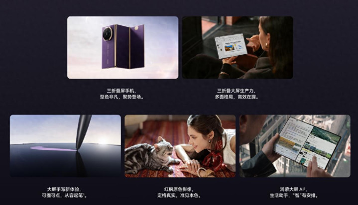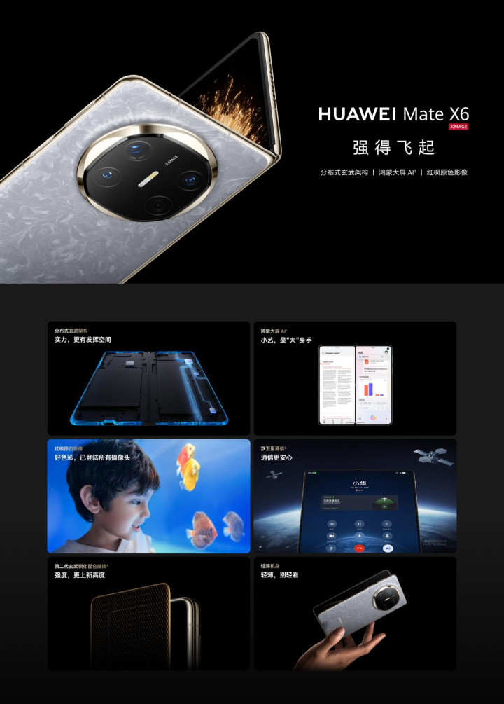 定位“全能旗舰”的大折叠华为Mate X6,则以轻薄全能的实力,打动了无数追求极致体验的高端用户。在影像方面,红枫原色影像镜头通过150万多光谱通道,可精准捕捉色彩信息,配合十档物理可变光圈与RYYB超感光传感器,无论远近明暗,环境光线如何复杂,都能还原真实场景,为用户带来所见即所得的拍照体验。在通信领域,双卫星通信搭配第二代灵犀通信,既能在日常生活中为用户带来稳定流畅的上网体验,更能在极端情况下确保用户与外界的沟通顺畅。分布式玄武架构带来的可靠性与散热表现提升,则能够搭配鸿蒙操作系统 5在流畅度、多任务、智能化等方面的升级,让用户在移动办公场景下,游刃有余的完成多任务处理。